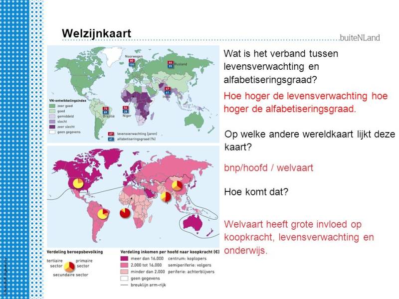 Welvaart meet je door te letten op : het bnp/hoofd en de verdeling van de beroepsbevolking. het bnp/hoofd is alles wat in een jaar verdiend wordt gedeeld door het aantal inwoners. Het bnp/hoofd in Nederland is 48.000 dollar, dat is best wel veel. Dat zorgt er voor dat Nederland behoord tot een van de meest ontwikkelde landen, of terwijl Nederland is een centrumland. Marokko heeft een bnp/hoofd van 5.500 dollar. Dat maakt Marokko dus een semi-perifeer land. Ook is Marokko een lagelonenland, dat wil zeggen dat er veel MNO's (Grote bedrijven die in meerdere landen fabrieken of kantoren hebben) daar hun bedrijf willen hebben omdat de lonen in Marokko lager zijn dan in de centrumlanden. Nederland heeft een grote beroepsbevolking. De beroepsbevolking is iedereen die tegen betaling werken plus alle werklozen. In Nederland werkt er minder dan 5% in de primaire sector (landbouw en visserij), minder dan 25% in de secundaire sector (industrie en bouw) en meer dan 70% werkt in de diensten sector (kantoren, winkels).