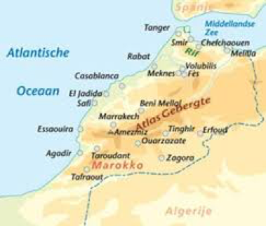 Door het midden van Marokko loopt de Hoge Atlas. De Hoge Atlas is deel van de het atlasgebergte dat door Noord-Afrika loopt. Je kan op deze kaart zien hoe de Atlasgebergte door Marokko loopt. De hoogste toppen bereiken de 4000 meter. Dat betekent dat de Atlasgebergte tot een hooggebergteword gerekend. Er is veel reliëfdoor de hoge toppen.Achter het Atlasgebergte ligt een uitgestrekte steenwoestijn met rotsen, grinden zandheuvels.